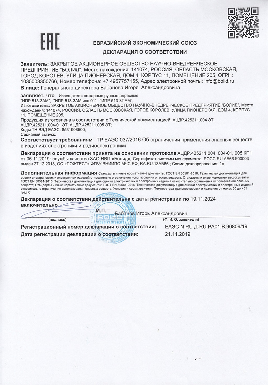 ИПР-513-3АМ исп.01 используется для формирования сообщения «Пожар» при нажатии на клавишу, применяется с контроллерами «С2000-КДЛ» и «С2000-КДЛ-2И». Прибор оснащён встроенным изолятором короткого замыкания. Особенности ИПР-513-3АМ исп.01: оснащён защитным стеклом, предохраняющим от случайных срабатываний; измерение значения напряжения ДПЛС в месте установки; световая индикация состояний и т.д. Диапазон рабочих температур изделия от -30 до +55 °С.