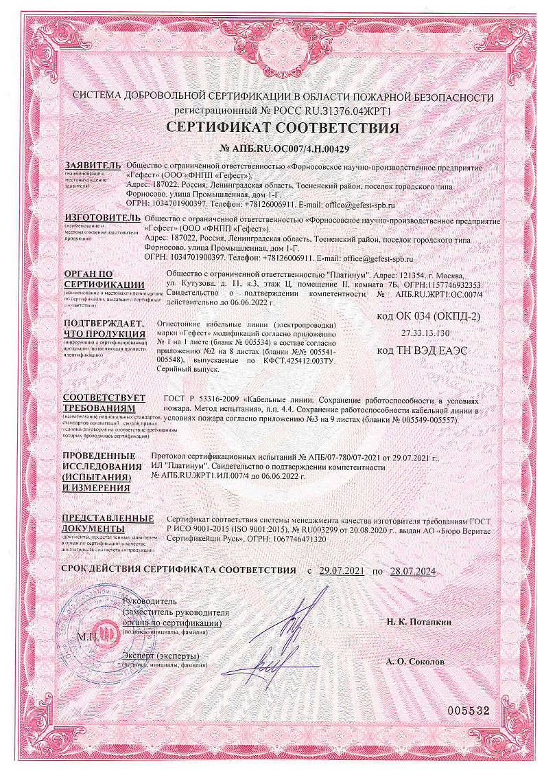 Сертификационными испытаниями подтверждено сохранение работоспособности до температуры 1020º С при напряжении 300 В (с учетом требований п.4.15 СП5 испытания проводились по ГОСТ Р 53316