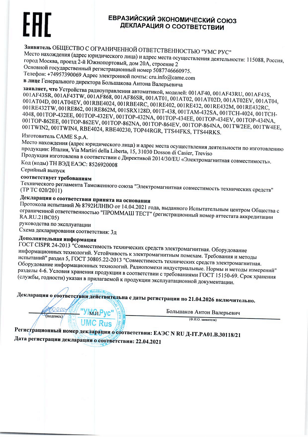 Плата-радиоприемник AF43TW 433.92 МГц производителя CAME для брелоков-передатчиков серии TWIN - идеальное решение автоматических систем для использования в жилых комплексах и местах с несколькими
